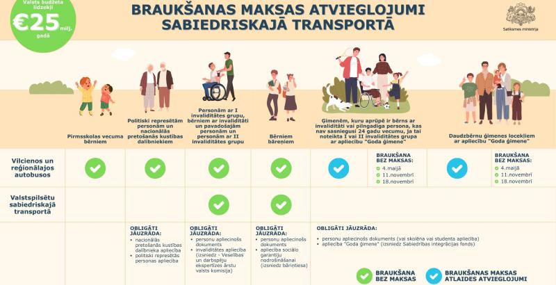 Vilcienos un reģionālajos autobusos bez maksas pārvietošanās tiek nodrošināta pirmsskolas vecuma bērniem, bērniem bāreņiem, politiski represētām personām un nacionālās pretošanās kustības dalībniekiem. Savukārt bērniem ar invaliditāti, personām, kurām noteikta I invaliditātes grupa un to pavadošajām personām un personām, kurām noteikta II invaliditātes grupa bez maksas pārvietošanās tiek nodrošināta gan reģionālajā, gan valstpilsētu sabiedriskajā transportā. Arī valstspilsētu sabiedriskajā transportā bērniem bāreņiem braukšana tiek nodrošināta bez maksas.