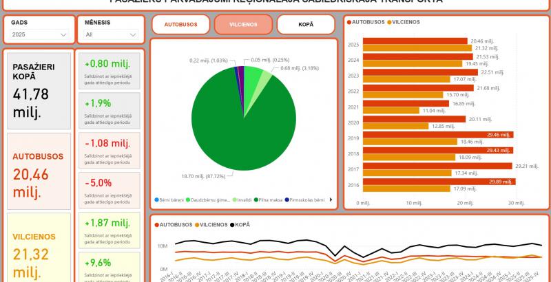 ATD apkopotie statistikas dati liecina, ka 2025. gadā valsts dotētajos reģionālās nozīmes autobusu un vilcienu maršrutos pārvadāto pasažieru skaits sasniedza 41,78 miljonus, kas ir par 2% jeb 795,93 tūkstošiem vairāk, nekā 2024. gadā, kad reģionālajā sabiedriskajā transportā tika pārvadāti 40,98 miljoni pasažieru.